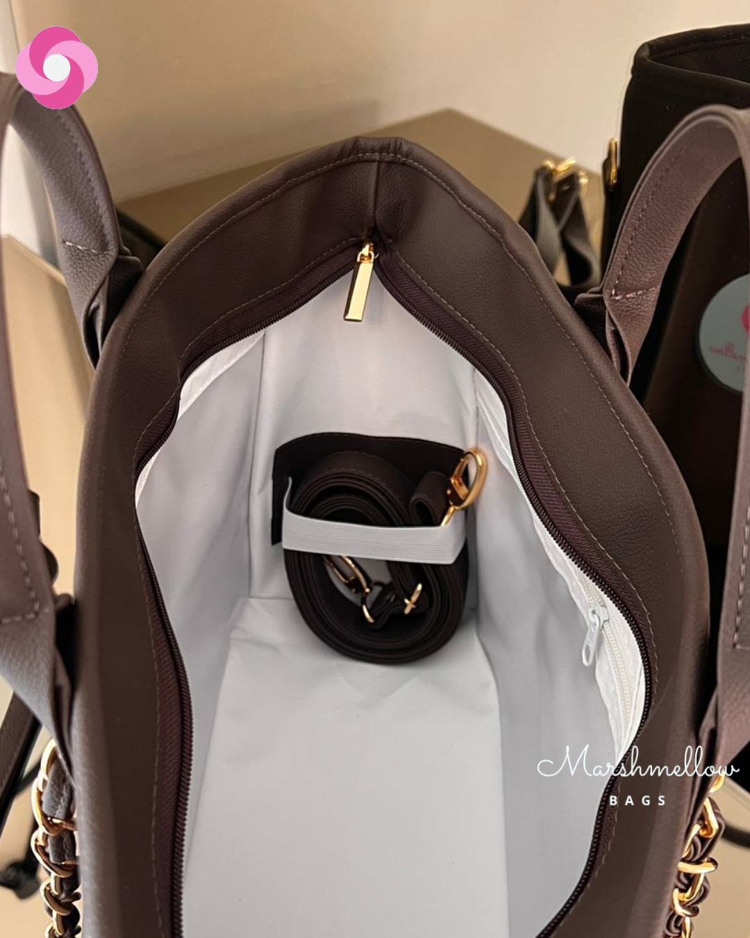 No compartimento principal o fechamento é de zíper e contém dois bolsos, sendo um com zíper. Nas laterais tem dois elásticos para acomodar mamadeiras, copinhos, etc. Na parte traseira temos um bolso de zíper pensado especialmente para acomodar seus itens, como celular, chaves do carro, casa, etc! Bolsa ideal para passeios de média duração.