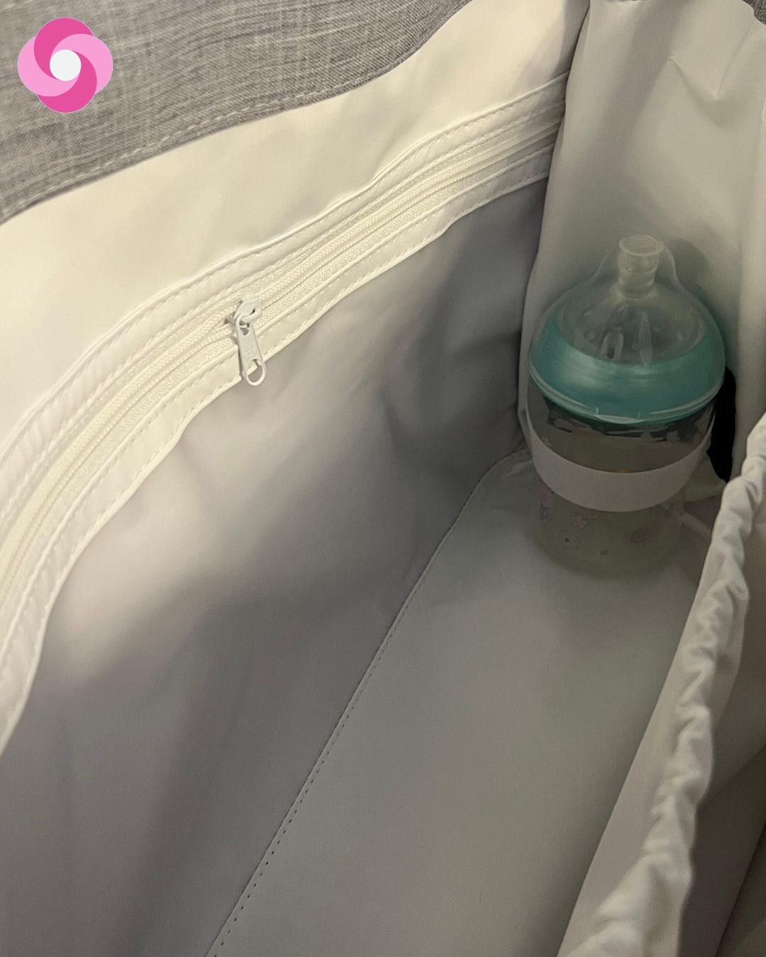 No interior ela tem 3 divisórias, sendo uma principal, com 2 elásticos porta mamadeiras e outras duas separadoras com fechamento em botão de imã! Ela é uma bolsa para passeios super longos e será uma super auxiliar para a ida à maternidade!