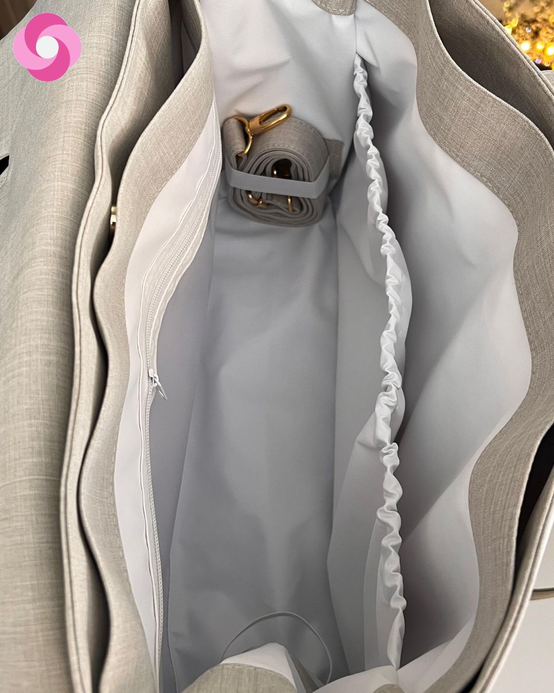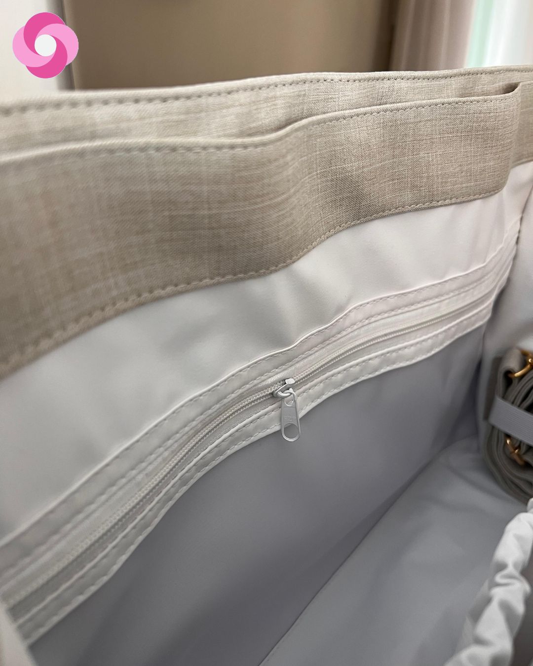 No interior ela tem 3 divisórias, sendo uma principal, com 2 elásticos porta mamadeiras e outras duas separadoras com fechamento em botão de imã! Ela é uma bolsa para passeios super longos e será uma super auxiliar para a ida à maternidade!