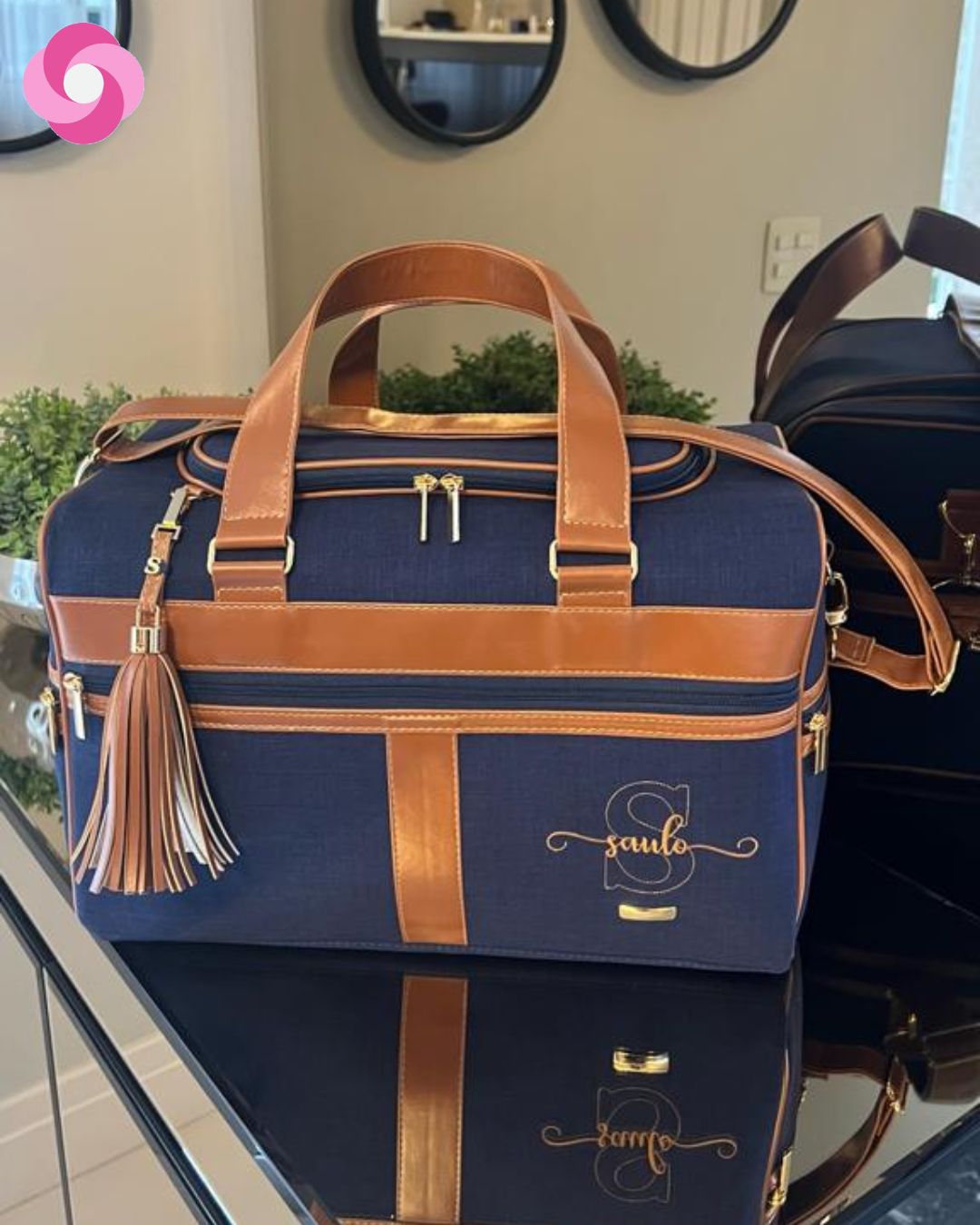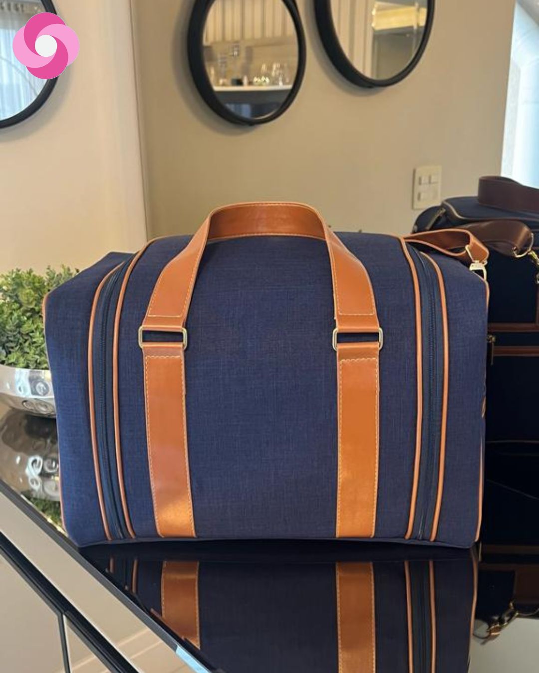 Mala Madison – Linho azul marinho + detalhes em sintético caramelo